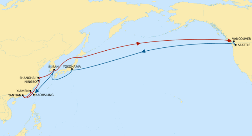 Kaohsiung (Taiwan) – Xiamen (China) – Yantian (China) – Ningbo (China) – Shanghai (China) – Busan (South Korea) – Vancouver (Canada) – Seattle (Washington) – Yokohama (Japan) – Busan (South Korea) – Kaohsiung (Taiwan)