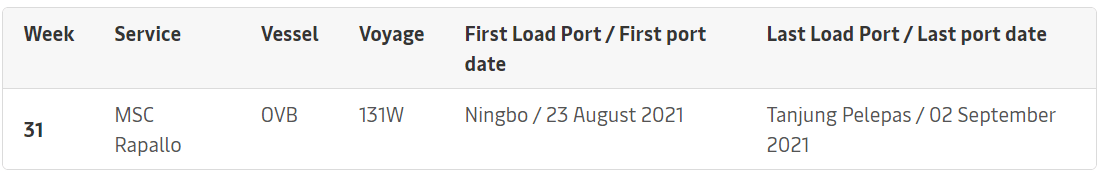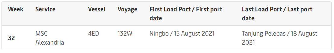 Ningbo– Shanghai – Xiamen – Tanjung Pelepas – Felixstowe – Rotterdam – Bremerhaven