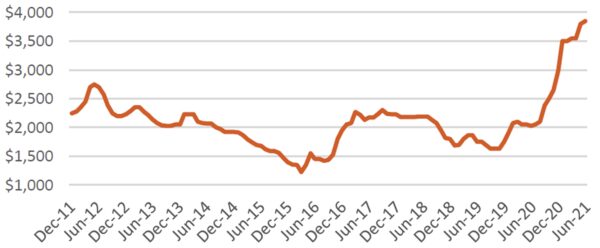 The price of a new container at this time two years ago, pre-COVID, was around $1,600 per TEU, less than half the current level.