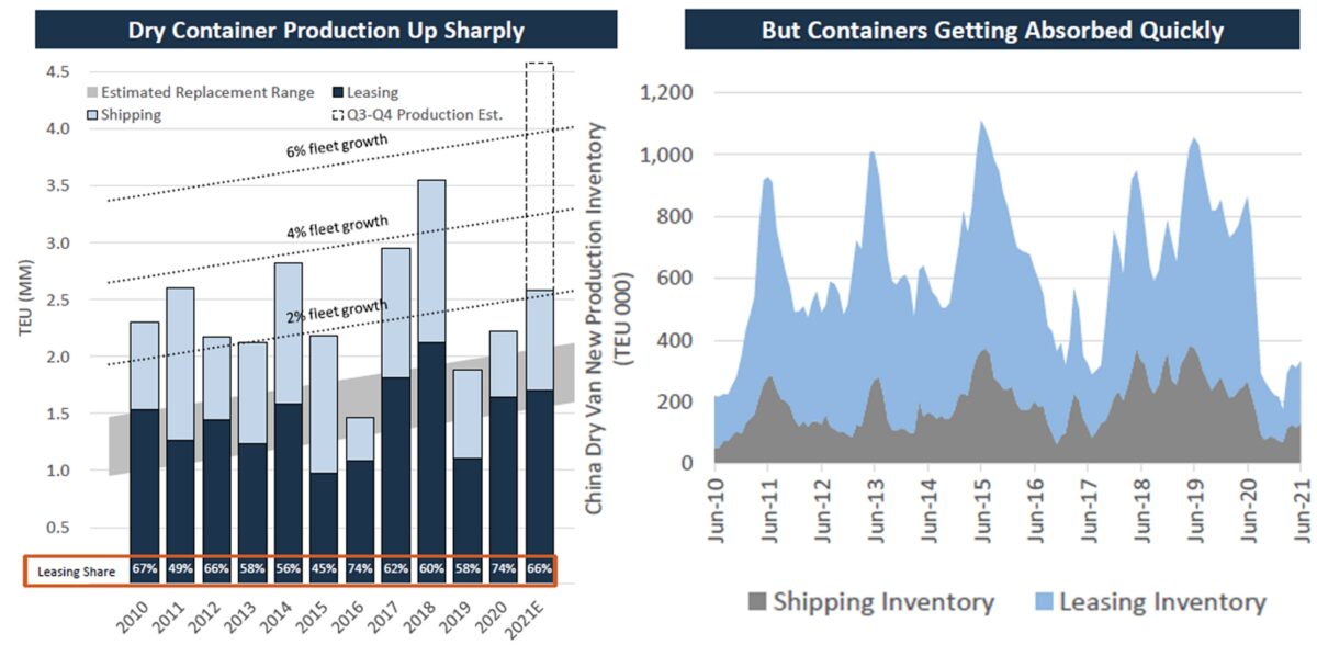 According to Triton’s estimate, which excludes sales to nonleasing and nonshipping buyers, factories built around 2.6 million TEUs of dry (nonrefrigerated/nontank) containers in H1 2021 — more than the 12-month totals in most years.