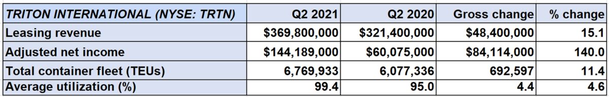 Triton reported adjusted net income of $144.2 million for the second quarter of 2021 compared to $60.1 million in the second quarter of 2020. Adjusted earnings per share of $2.14 topped the consensus estimate for $1.96.
