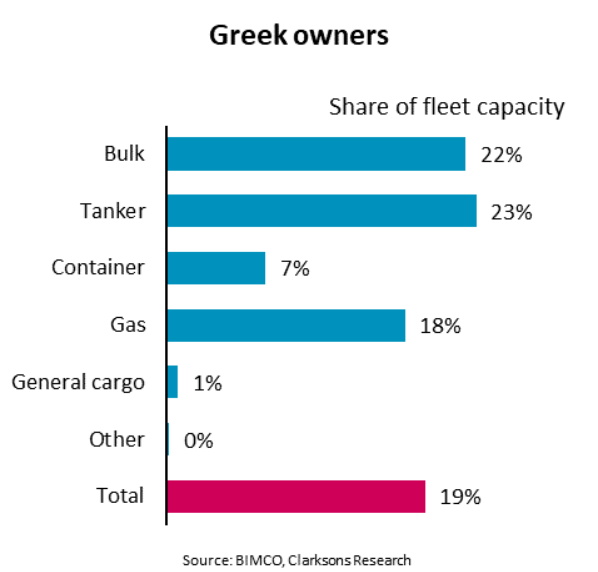 "Measured by cargo capacity, Greek shipowners control the world’s largest fleet of cargo carrying ships. In total, they control 19% of the cargo carrying capacity and maintain a particularly high share within the dry bulk, tanker, and gas carrier sectors," says Rasmussen.