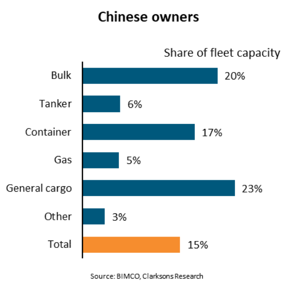 The focus of Chinese shipowners has been slightly different. They control a smaller share of tankers and gas carriers but a higher share of the general cargo and container fleets, with COSCO Shipping contributing to the higher share of the container fleet.