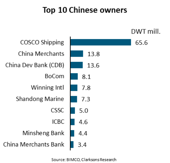 The entry of Chinese financial institutions into the leasing market has significantly contributed to the growth of the Chinese owned fleet in recent years, and five out of the 10 largest Chinese shipowners are leasing institutions. Combined, the ten largest shipowners control 41% of the Chinese owned fleet.