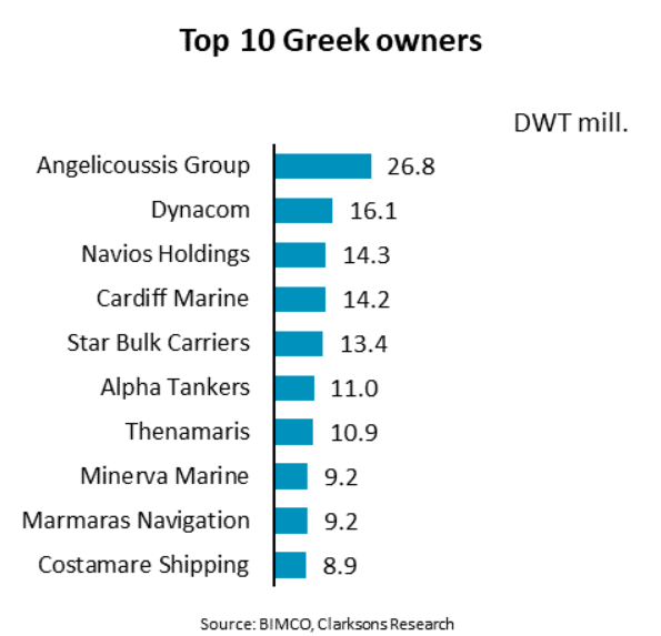 The ten largest Greek shipowners are all “traditional” shipowners. Unlike the top ten Chinese owners, the top ten list of Greek shipowners is not dominated by one large owner. Instead, there are seven owners with fleets larger than 10 million deadweight tonnes whereas only three Chinese shipowners have such large fleets.