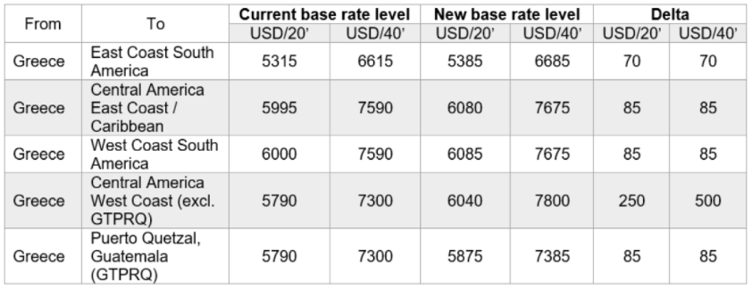 Hapag-Lloyd will also apply the following increases from Greece to Latin American ports.