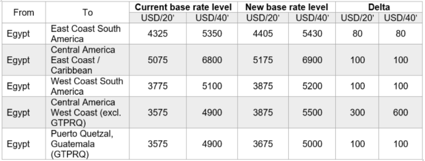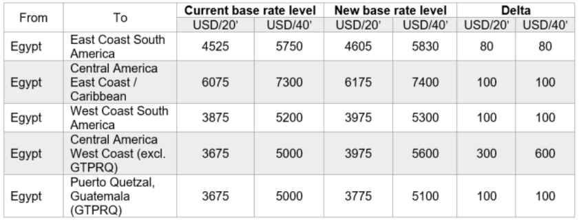 Additionally, an ocean tariff rate increase from Egypt to Latin America will be implemented by the Hamburg-based carrier for dry and reefer containers, as follows: