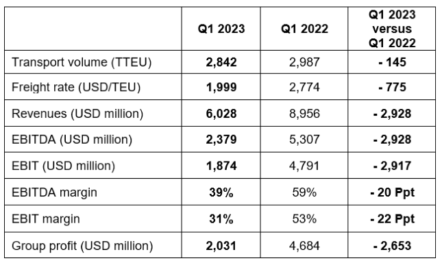 Hapag-Lloyd ended the first quarter of 2023 with container volumes 4.9% lower than in the first quarter of last year, at 2,842,000 TEUs.