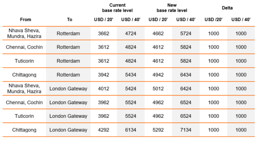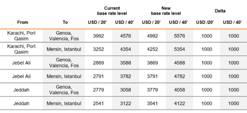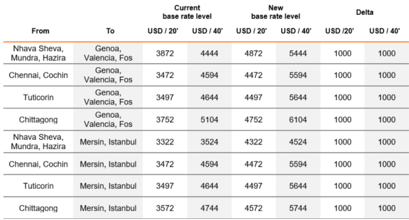 Two weeks later, the liner operator will implement a new ocean tariff rate increase of US$1,000 for all types and sizes of cargo, from the Indian Subcontinent to the Mediterranean, as follows: