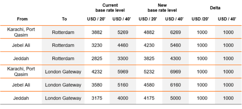 Lastly, effective from the same date, the updated Hapag-Lloyd prices for dry containers from the Middle East and Pakistan to North Europe will be as follows: