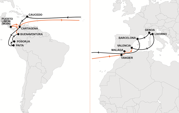 Valencia (Spain) – Livorno (Italy) – Genoa (Italy) – Barcelona (Spain) – Caucedo (Dominican Republic) – Cartagena (Colombia) – Paita (Peru) – Posorja (Ecuador) – Buenaventura (Colombia) – Puerto Limon (Costa Rica) – Cartagena (Colombia) – Tangier (Morocco) – Malaga (Spain) – Valencia (Spain)