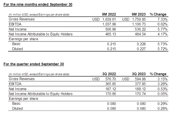 ICTSI reported Earnings Before Interest, Taxes, Depreciation and Amortisation (EBITDA) of US$1.11 billion, 7% higher than the US$1.04 billion generated in the same period last year and net income attributable to equity holders of US$484.54 million, 4% more than the US$465.13 million earned in the first nine months of 2022