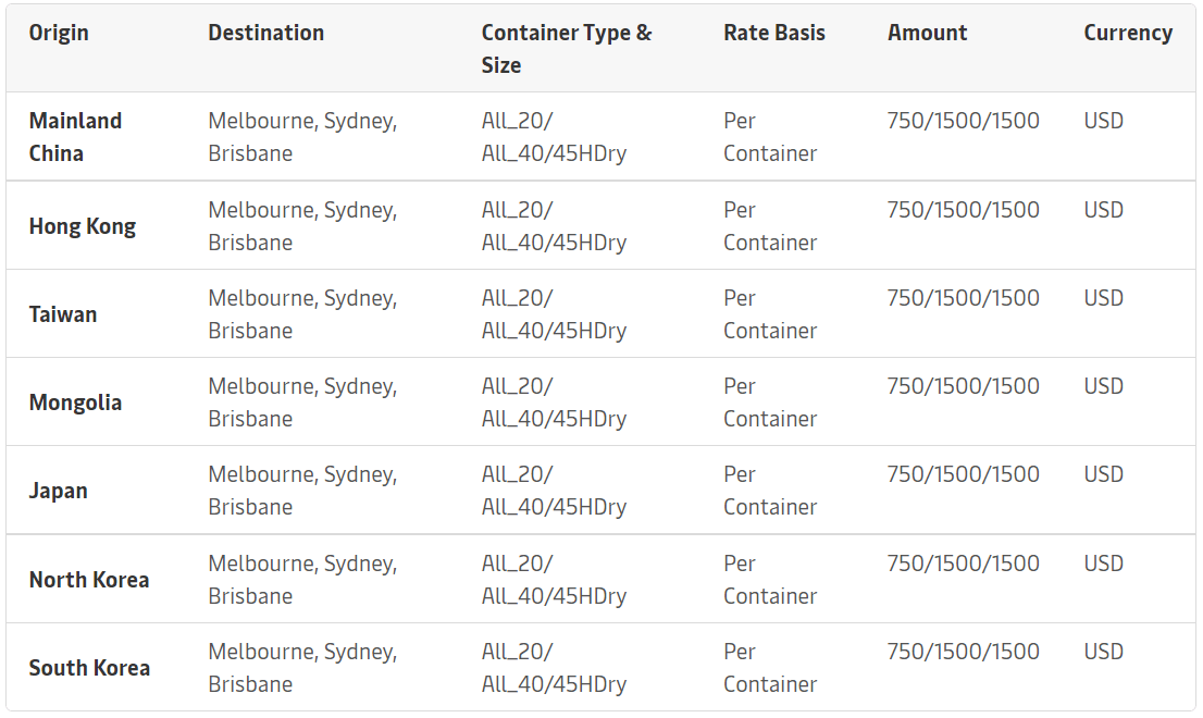 In particular, Maersk will push up its rates for all types of cargo, from Mainland China, Hongkong, Taiwan, Mongolia, Japan, North Korea and South Korea to the Australian ports of Melbourne, Sydney, Brisbane, starting on 16 August, as follows: