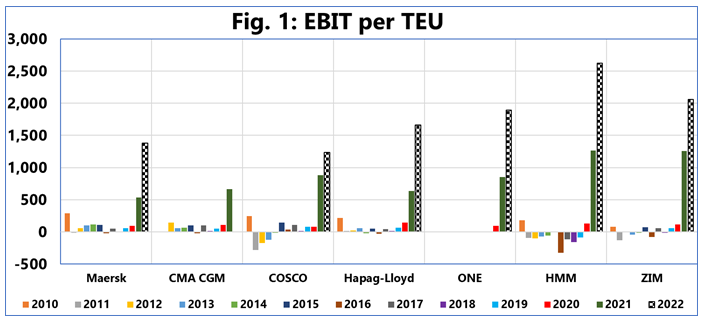 "The 2022-Q2 EBIT/TEU figure of each of these box lines dwarfs each of the previous years, with the latter hardly relevant in context of the outsized EBIT/TEU numbers that we are seeing right now," pointed out Sea-Intelligence in its report.