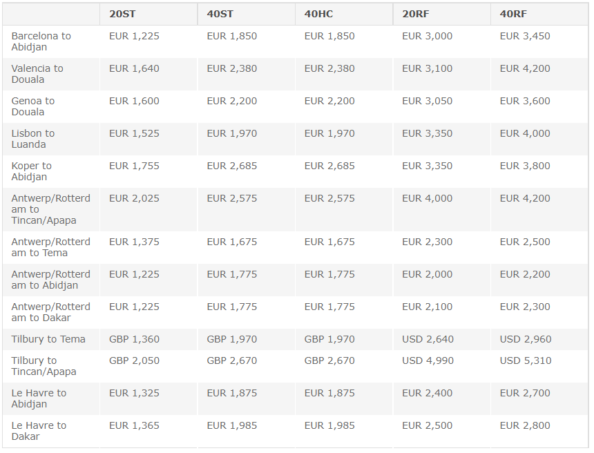 On the same date, CMA CGM will raise its FAK rates from North Europe, Baltic, Scandinavia, West Mediterranean, Adriatic and the Black Sea to all ports of West Africa for standard containers, reefer boxes and HC, as follows: