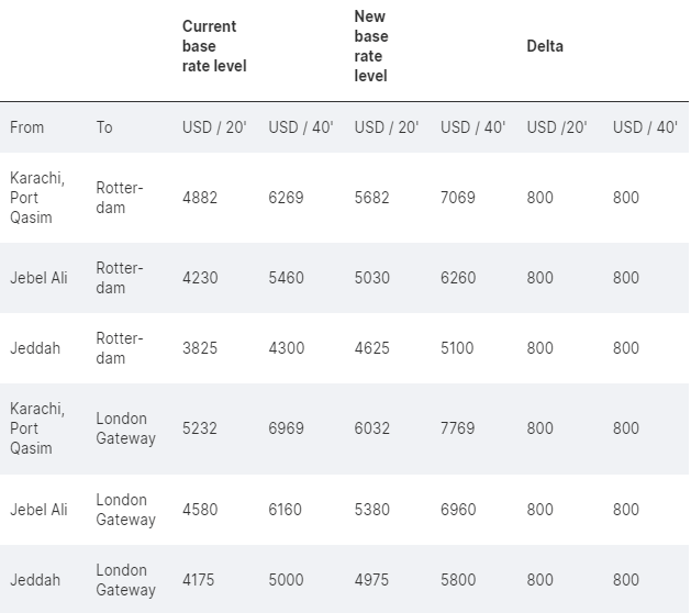Firstly, Hapag-Lloyd will implement an ocean tariff rate increase of US$800 per 20' and 40' standard container, including high cubes (HC), from the Middle East and Pakistan to the ports of Rotterdam and London Gateway in North Europe.