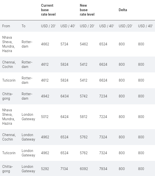 During the same period, the German carrier will impose an equal increase for the same type of cargo from the Indian Subcontinent to the above-mentioned destinations.