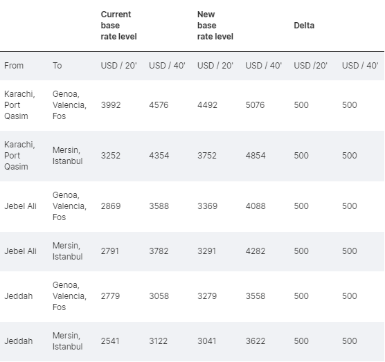 In the meantime, Hapag-Lloyd will apply another ocean tariff rate increase of US$500 from the Middle East and Pakistan to the Mediterranean. Hence, the new rates will be as follows: