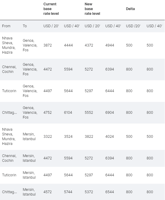 Furthermore, the Hamburg-based liner operator will set the following ocean tariff rate increase for general purpose containers, for sailings from the Indian Subcontinent to the Mediterranean that will also be effective for the first two weeks of September.