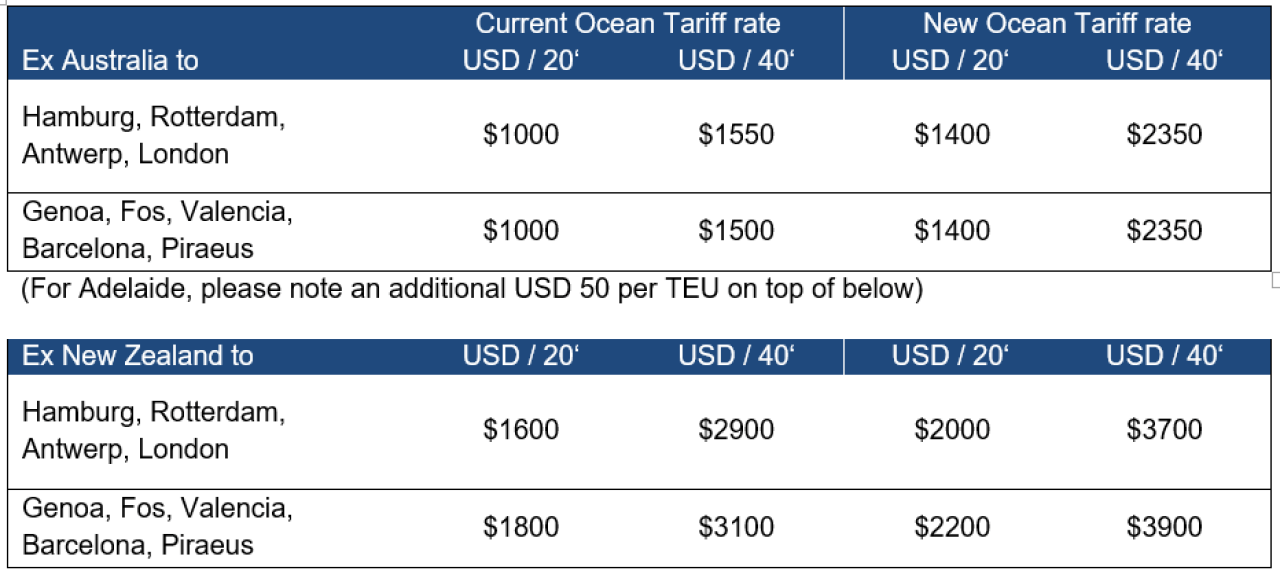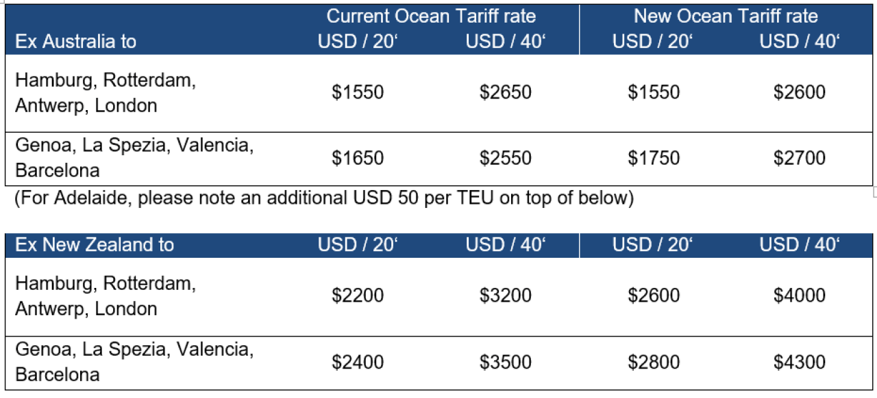 Applicable from 17 August, a new increase will also be implemented by Hapag-Lloyd for dry and reefer containers travelling from Australia and New Zealand to all destinations in Europe.