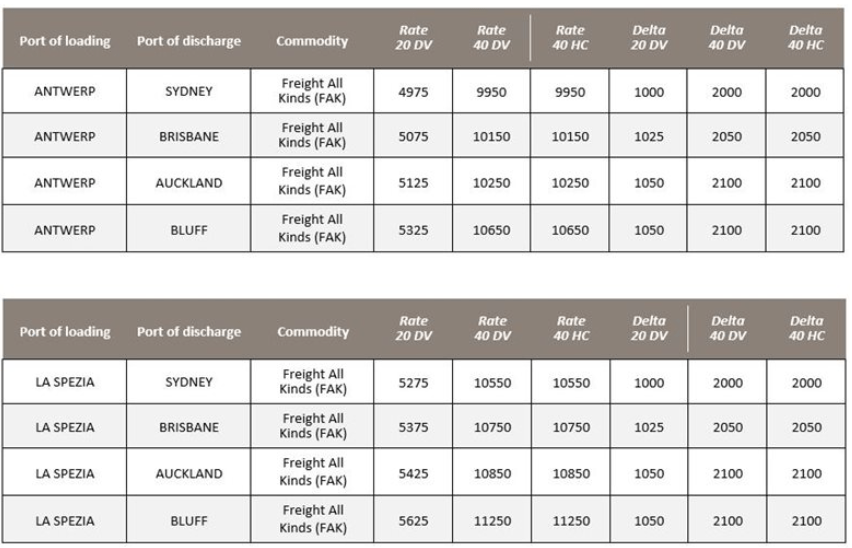 Moreover, the Swiss container line MSC will push up its Freight All Kind (FAK) rates for the trade between European ports in Antwerp and La Spezia and Australia/New Zealand.