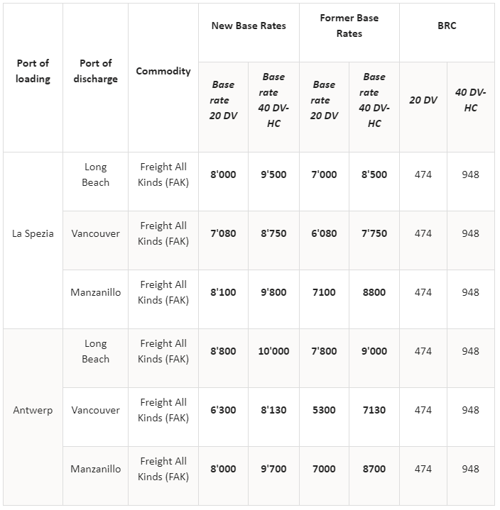 Furthermore, the Geneva-based carrier will introduce the following FAK rate increase for sailings from the ports of Antwerp and La Spezia to the US, Canada and Mexico West Coast, which will begin on 1 September.