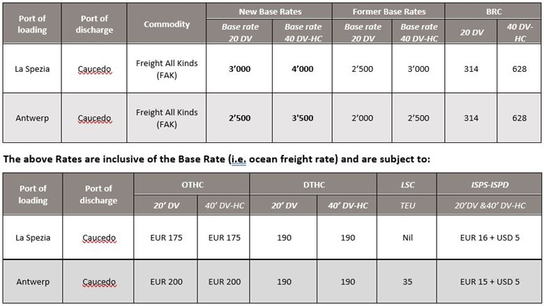 MSC has decided to push up its rates from Antwerp and La Specia to the Port of Caucedo in the Caribbean as follows: