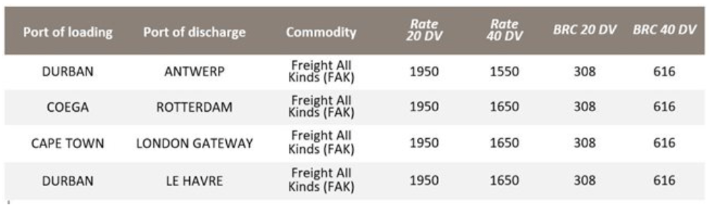 For the shipments from Durban destined to the port of Antwerp, the price per 40' box will be US$1,550.