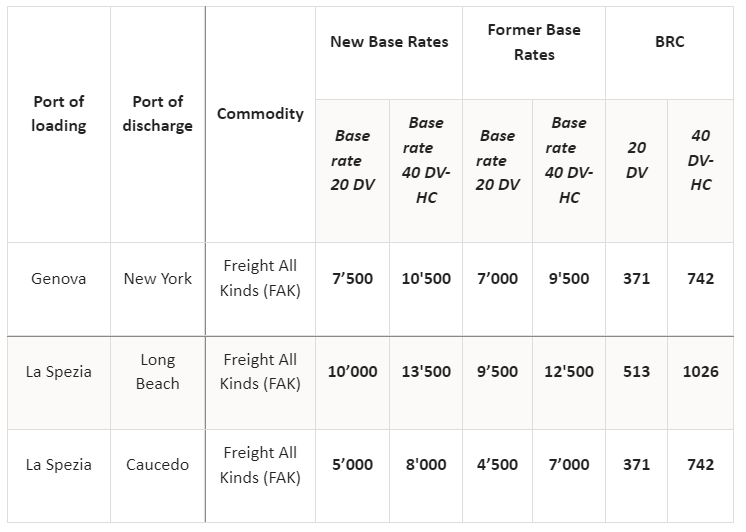 Moreover, MSC will raise its FAK rates for 20', 40' and high cube (HC) dry containers that will be transferred from the Italian ports of La Spezia and Genova to New York, Long Beach and Caucedo.