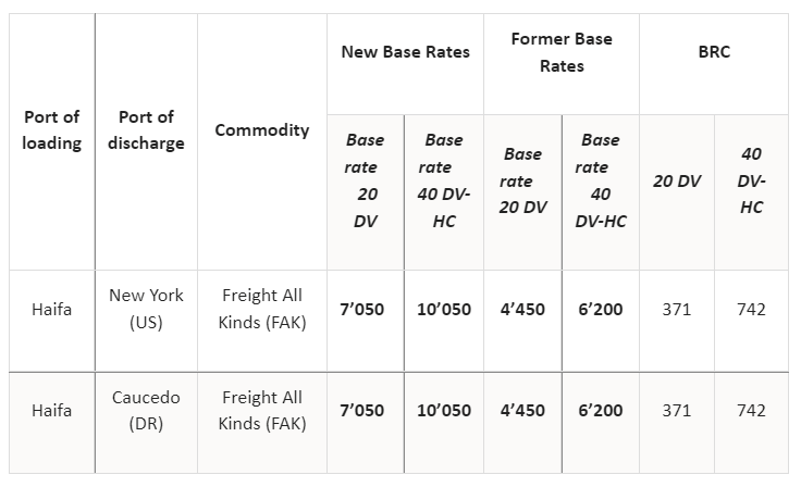 More specifically, the Swiss/Italian carrier will impose a FAK rate increase for cargoes travelling from the Israeli port of Haifa to New York and Caucedo. The increase will be US$2,600 per 20', and US$3,850 per 40' and HC standard container.