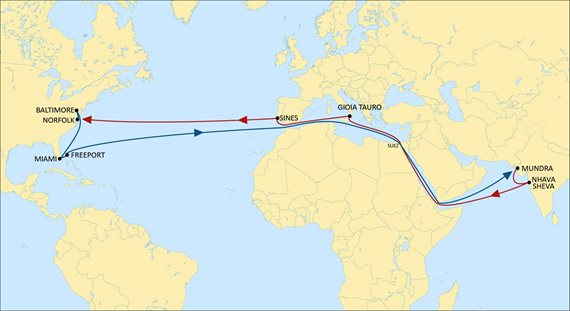 Mundra – Nhava Sheva – Gioia Tauro – Sines – Norfolk – Baltimore – Miami – Freeport – Mundra