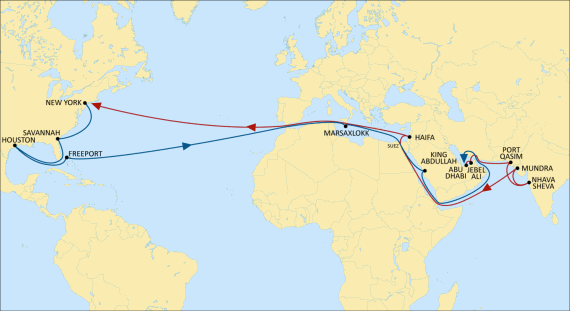 Mundra – Nhava Sheva – Colombo – Barcelona – Valencia – Sines – New York – Savannah – Charleston – Mundra