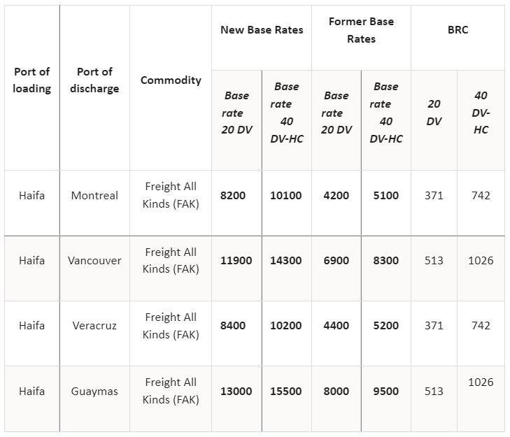 The Swiss/Italian shipping line will push up its Freight All Kinds (FAK) rates, for cargoes transferred from the port of Haifa, to the Canadian ports of Vancouver and Montreal, as well as to the ports of Veracruz and Guaymas in Mexico.