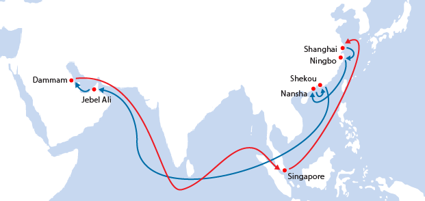 The new port rotation of Gulf China Service (GCS) is Shanghai (China) - Ningbo (China) - Nansha (China) - Shekou (China) - Jebel Ali (United Arab Emirates) - Dammam (Saudi Arabia) – Singapore – Shanghai (China)