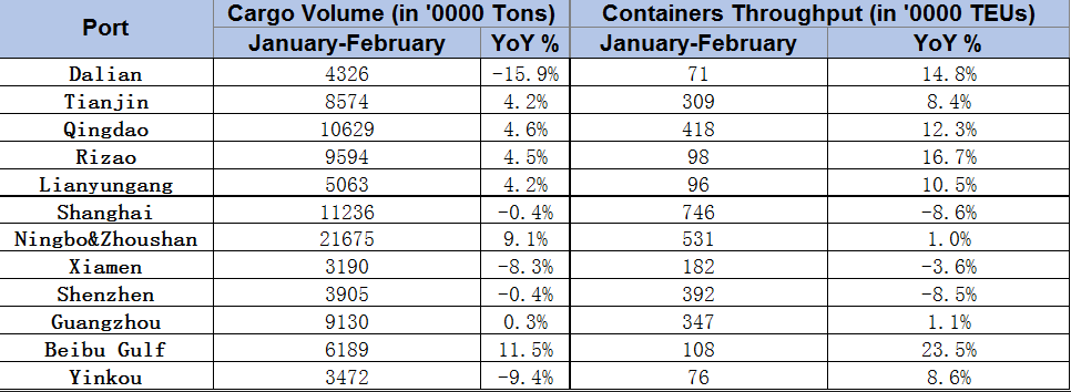 The container throughput of the 12 major Chinese ports was 44.1 million TEUs in the first two months of the year, representing a year-on-year slight increase of 1.3%.