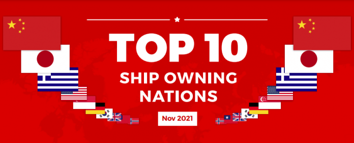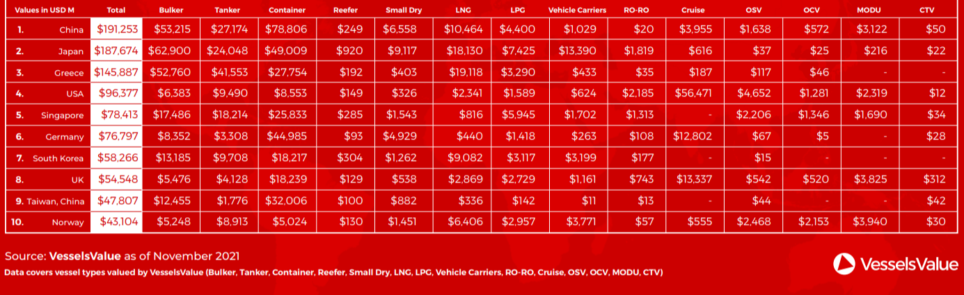 November 2021 total fleet values in the following Top 10 Ship Owning Nations list include the following vessel types: Bulker, Tanker, Container, Reefer, Small Dry, LNG, LOC, Vehicle Carriers, RoRo, Cruise, OSV, OCV, MODU and CTV.
