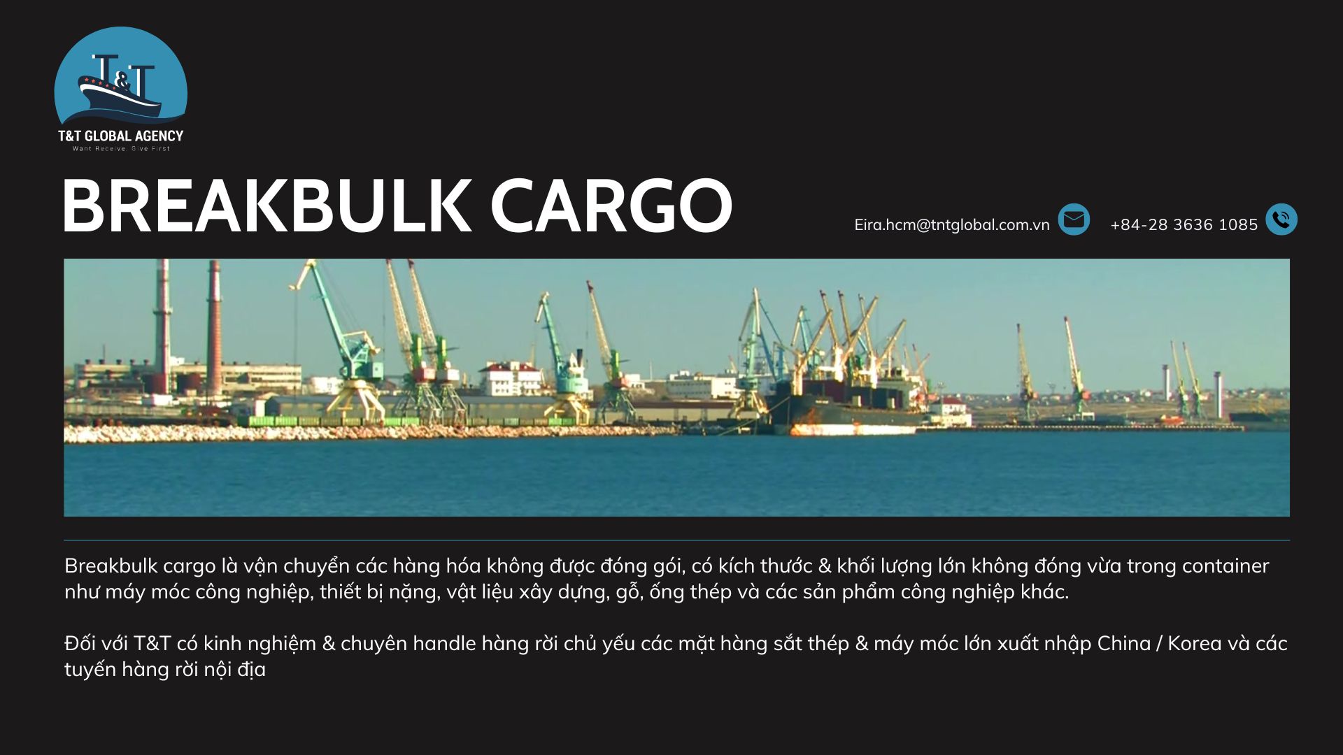 For T&T, we have experience and specialize in handling bulk cargo, mainly iron and steel items & large machinery imported and exported to China/Korea and domestic bulk cargo routes.