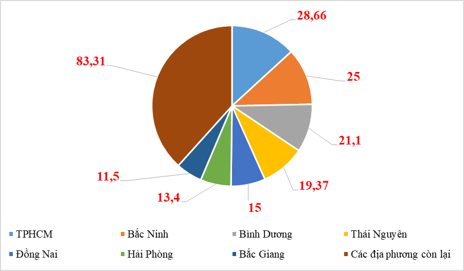Trong 6 địa phương còn lại, TPHCM tiếp tục duy trì vị thế dẫn đầu với 28,66 tỷ USD, tăng 7,54%.