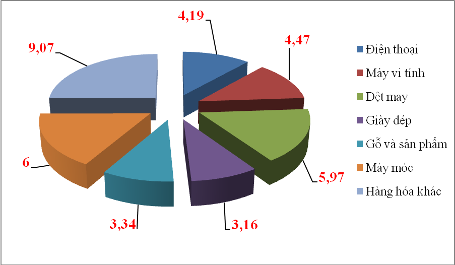 Hết tháng 4 có 6 nhóm hàng xuất khẩu sang Hoa Kỳ đạt kim ngạch hơn 1 tỷ USD gồm: dệt may; điện thoại; máy vi tính; máy móc; gỗ và sản phẩm gỗ; giày dép.