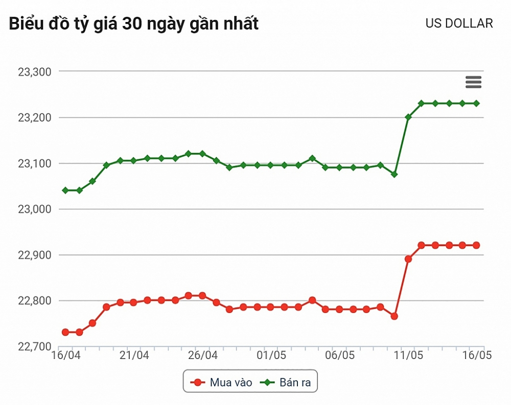 Khảo sát của phóng viên trên thị trường cho thấy, tỷ giá VND/USD trên thị trường liên ngân hàng từ ngày 16/3 (lần FED tăng lãi suất đầu tiên) tới nay đã tăng 0,36% khi chỉ số đồng USD (DXY) tăng 6,02% so với ngày 16/3. Tại các ngân hàng thương mại, tính tới phiên ngày 16/5, tỷ giá VND/USD đang đứng ở mức 22.900-23.230 VND/USD (mua vào - bán ra), tăng gần 130 đồng trong gần 7 ngày qua.